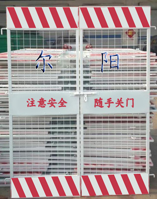 3、产品规格: 铁丝网片施工电梯防护门现货为 高1.8米,宽1.5米。中间腰板15公分,下面踢脚板15公分,表面覆盖30*30mm网片,丝径为3mm。重量在10kg左右。【其他规格可定制】表面颜色为黄色,红色字体:“注意安全随手关门”;黄黑相间踢脚 线。